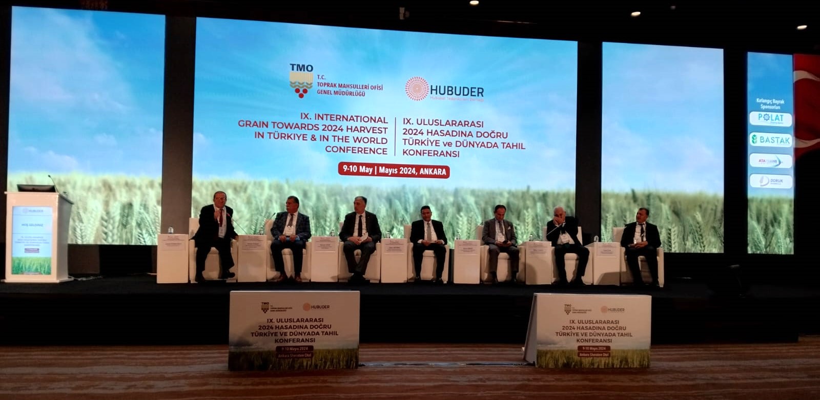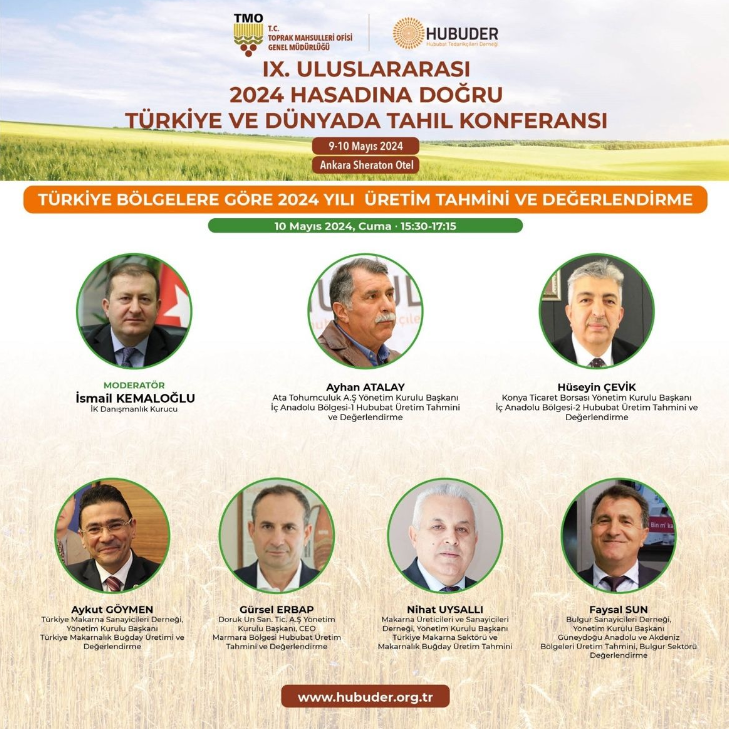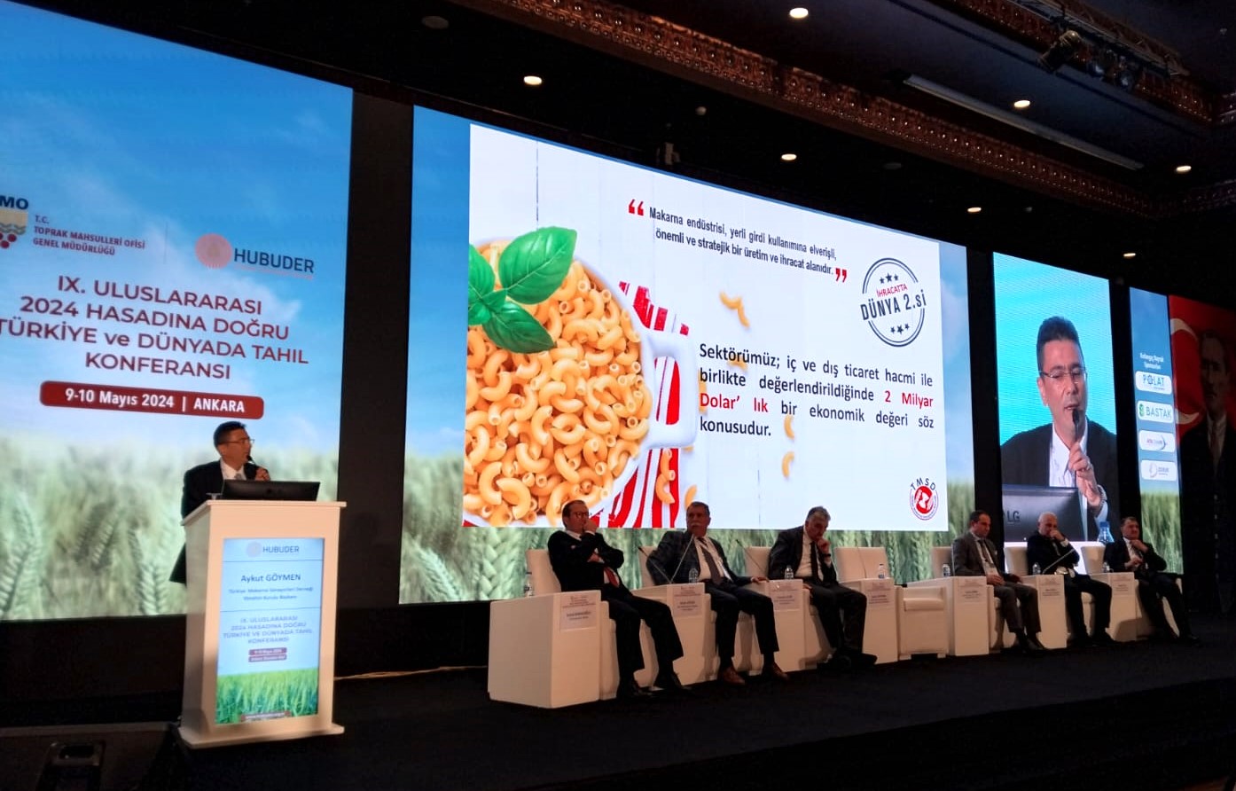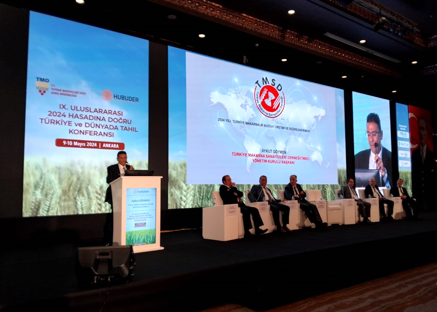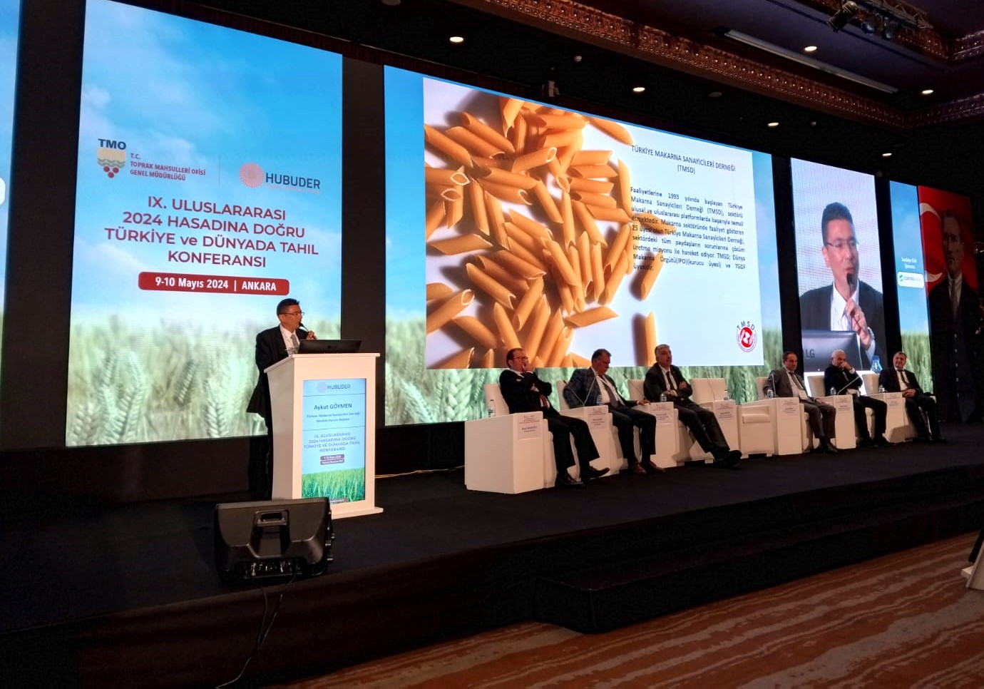 Türkiye Makarna Sanayicileri Derneği (TMSD ) Yönetim Kurulu Başkanı Sn. Aykut GÖYMEN, Hububat Tedarikçileri Derneği (HUBUDER ) tarafından 9-10 Mayıs 2024 tarihleri arasında Ankara Sheraton Otel’de yapılan ‘IX. Uluslararası 2024 Hasadına Doğru Türkiye ve Dünyada Tahıl konferansı’na katılım sağladılar. Sn.GÖYMEN; 10 Mayıs tarihinde moderatörlüğünü Sn. İsmail KEMALOĞLU’ nun yaptığı ‘Türkiye’de Bölgelere Göre 2024 Yılı Üretim Tahmini ve Değerlendirme ‘ başlıklı 2.oturumda ‘Türkiye’de Makarnalık Buğday Üretimi ve Değerlendirme’ konulu bir sunum gerçekleştirdiler.