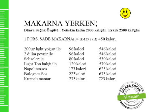 Makarna yerken : 1 porsiyon sade makarna(125 (1/4 paket)gr kuru makarna olarak düşündüğümüzde)450 kaloridir. Eğer buna 200 gr light yoğurt eklerseniz ya da 2 dilim peynir eklerseniz yaklaşık 546 kalori eder. Sebzeyle yapacağımız diyosanız 530 kalori, light ton balığı ile 570 kalori, napoliten sos ile 623 kalori, bolognez sos ile 673 kalori,kremalı mantar ile 723 kalori eder. Az önce bir insanın günlük kalori ihtiyacından bahsetmiştim. İşte makarnaya eklediğiniz içeriğe göre kalori miktarı da değişiyor. Eğer dengeliyorsak sorun yok.