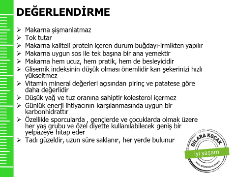Karbonhidratın sadece cinsi değil aslında kalitesi ve ne miktarda yenildiği de bir bütün olarak değerlendirilmelidir .Araştırma sonuçlarına göre topluma sorulduğunda toplumun %36’sı makarnanın kilo yapmadığını düşünüyor. Bu ne demek oluyor: Toplumun %64’ü de makarnanın kilo yaptığını düşünüyor.